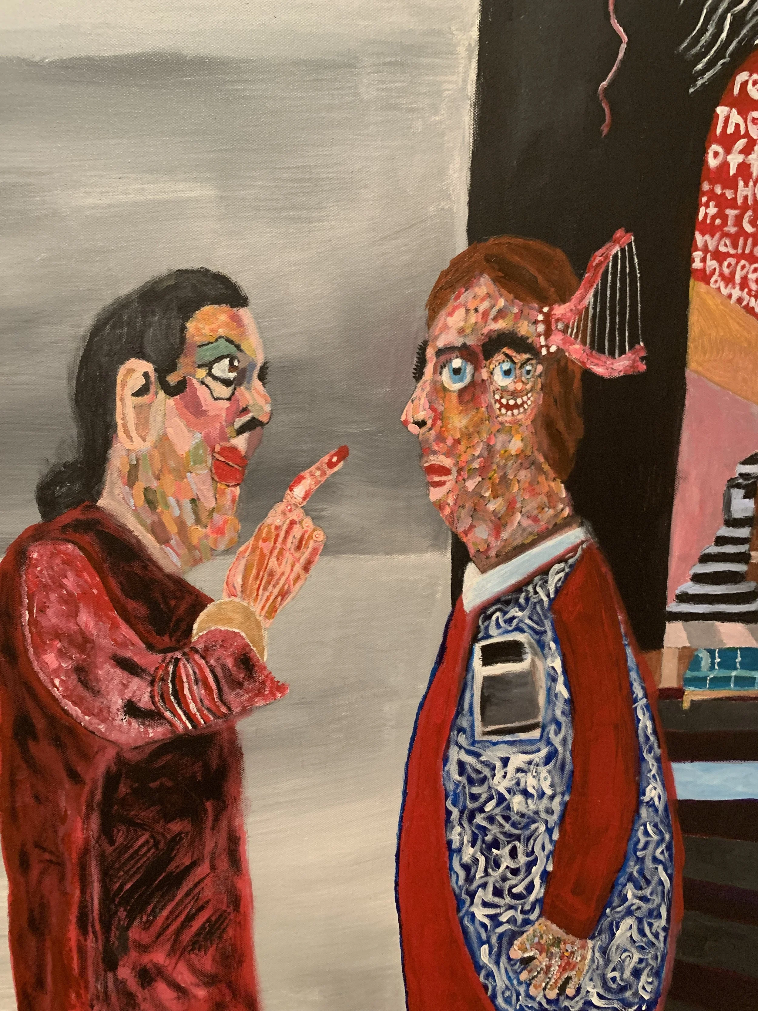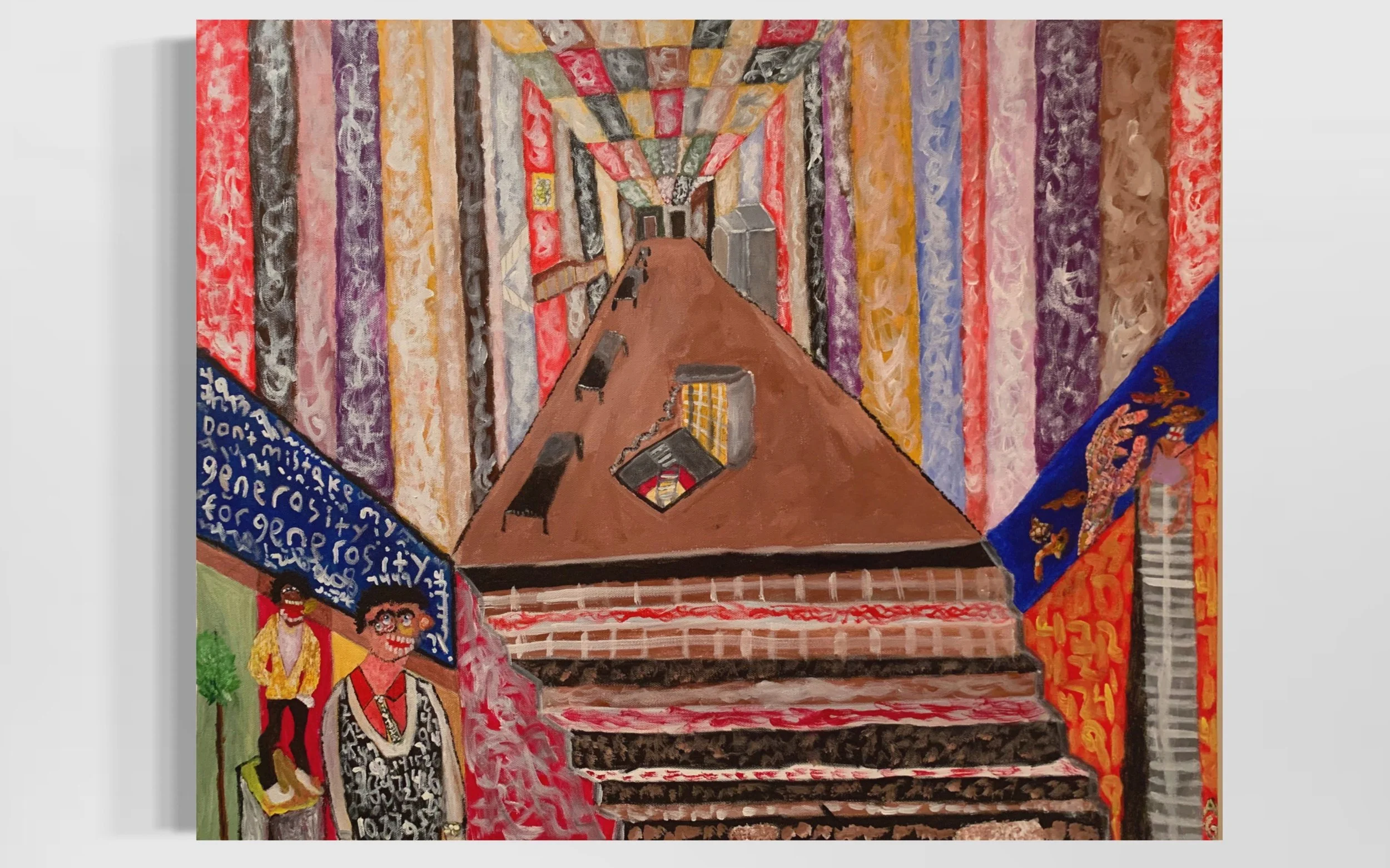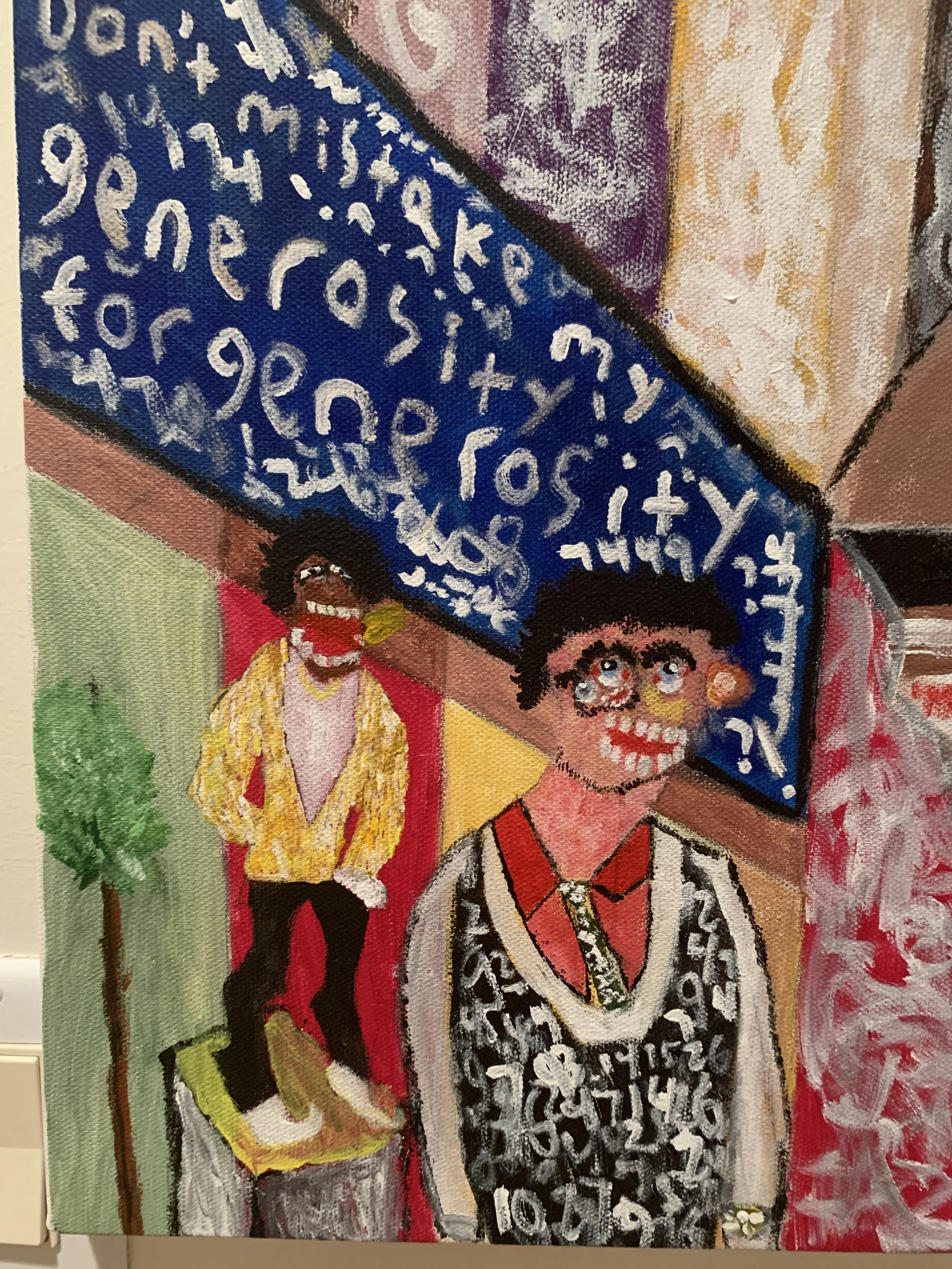The text near the bottom left of the painting reads, “Don’t mistake my generosity for generosity.”