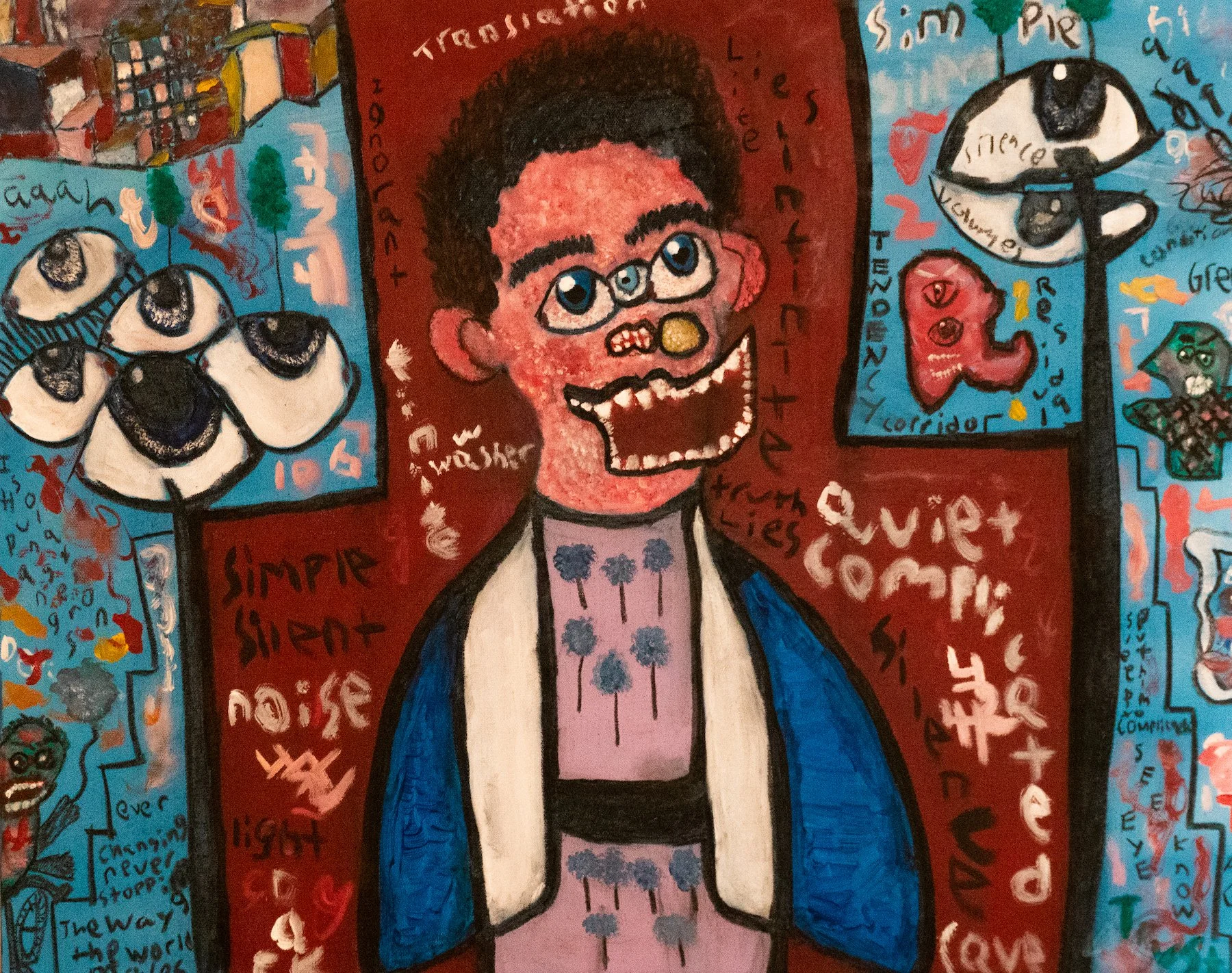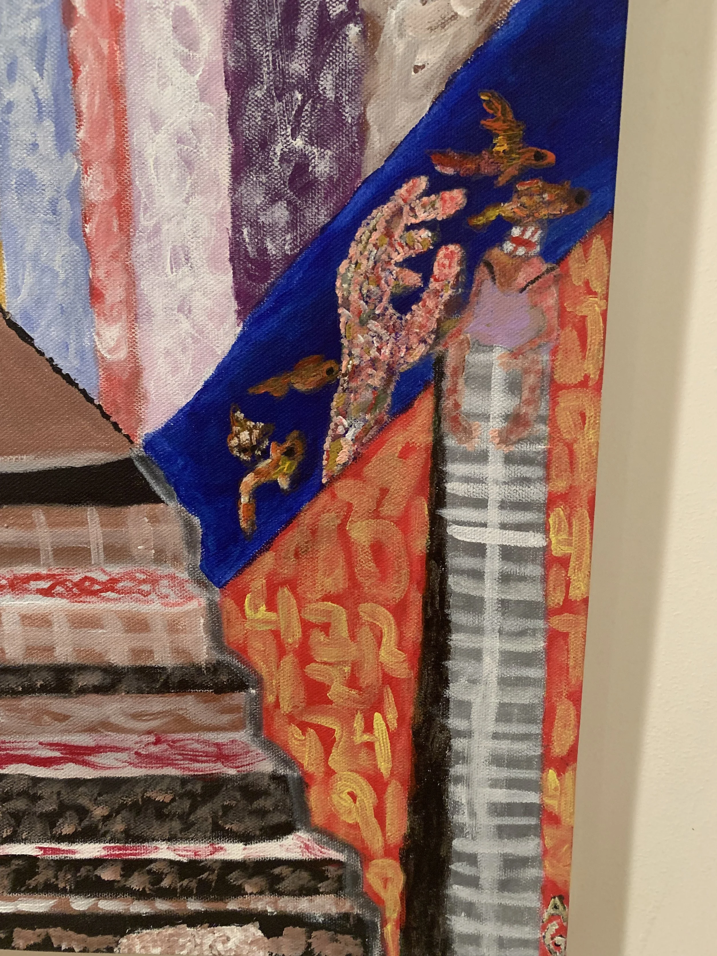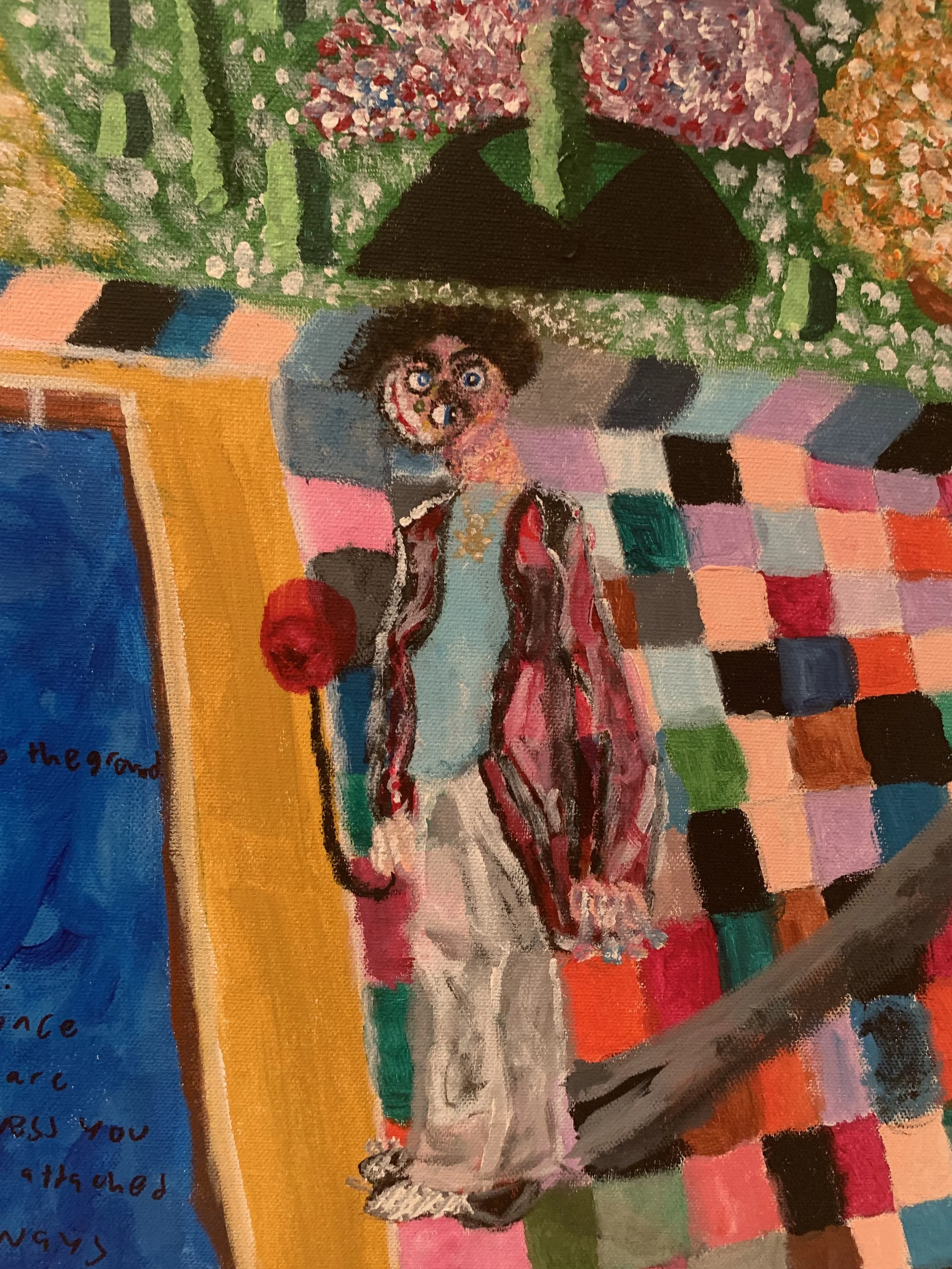 The text near the bottom left of the painting reads, “Don’t mistake my generosity for generosity.”